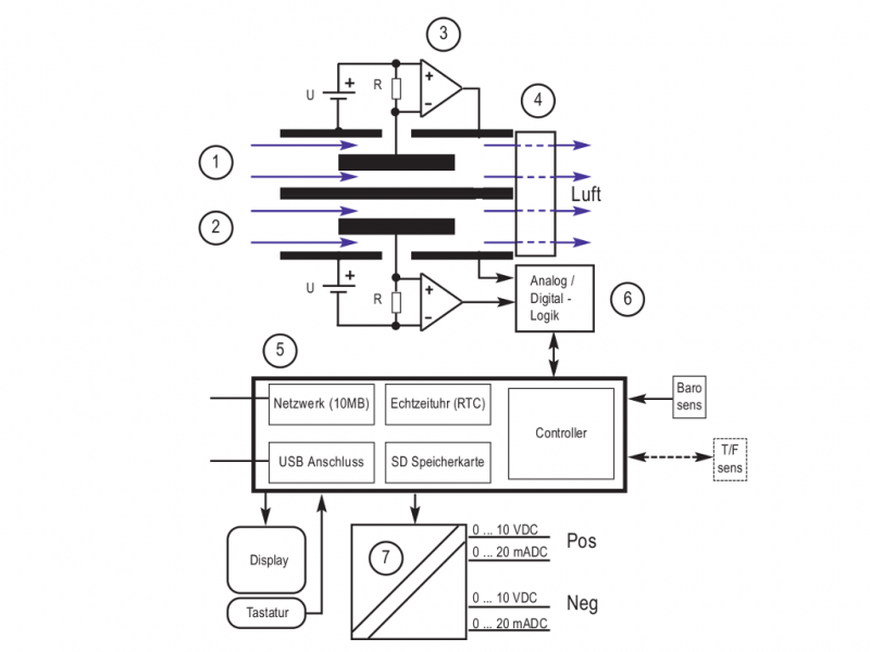 Funktion Das Messsystem besteht aus zwei äußeren Rohrelektroden (1 u. 2), in die zentrisch und elektrisch isoliert je eine kleinere Elektrode montiert sind. Zwischen den äußeren und den inneren Elektroden wird ein Gleichspannungspotenzial angelegt und somit ein elektrisches Gleichfeld zwischen den Elektroden erzeugt. Der Ventilator (4) saugt kontinuierlich Luft mit einem definierten Volumenstrom durch die beiden Rohrelektroden. Das elektrische Gleichfeld übt im Elektrodenbereich eine Kraft auf die Ionen in der durchströmenden Luft aus (Coulombsches Gesetz) und lenkt sie zu den inneren Elektroden. Da die Polaritäten der angelegten Spannung in den beiden Elektroden unterschiedlich sind, werden in der einen Elektrode die positiv geladenen Ionen und in der anderen Elektrode die negativ geladen Ionen zur Innenelektrode beschleunigt. Die Strömungsgeschwindigkeit der Luft, die Höhe der Ablenkspannung und die Geometrie der Elektroden sind so bemessen, dass die Ionen ab einer definierten Ionenbeweglichkeit die inneren Elektroden erreichen. Luftionen mit einer geringeren Ionenbeweglichkeit (Mittel- und Großionen) erreichen nur teilweise die Innenelektrode. Der bei der Ladungsneutralisierung fließende Ladungsstrom erzeugt an sehr hochohmigen Widerständen (R) (bis zu 1011 Ohm) einen messbaren Spannungsabfall, der mit geeigneten Messverstärkern (3) zu einem der Luftionenkonzentration proportionalen Messwertsignal aufbereitet und noch in der Vorstufe (6) digitalisiert wird. Gesteuert wird der gesamte Ablauf mit einem Mikrokontroller (5) der außerdem das Display, die Speicherlogik, die Analogausgänge (7), die USB-Schnittstelle, die Netzwerkschnittstelle und die Klimasensoren bearbeitet. Das IM806V2 verfügt über einen integrierten barometrischen Drucksensor. Optional ist ein externer Temperatur- und Feuchtesensor (T/F sens) zur Erfassung der Lufttemperatur und relativen Luftfeuchtigkeit verfügbar. Anwendung Ionometer zur Messung der Luftionenkonzentration finden Anwendung in: